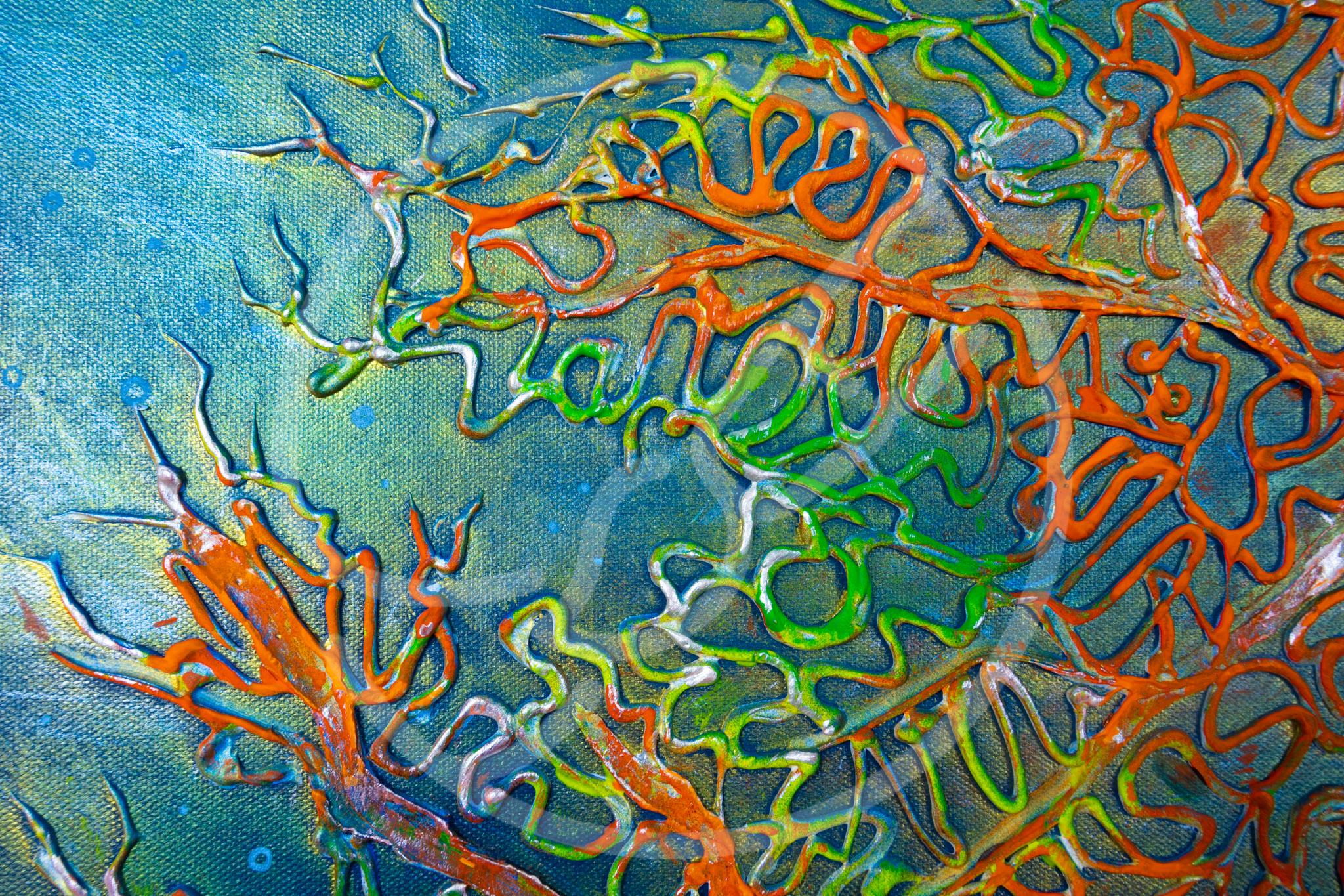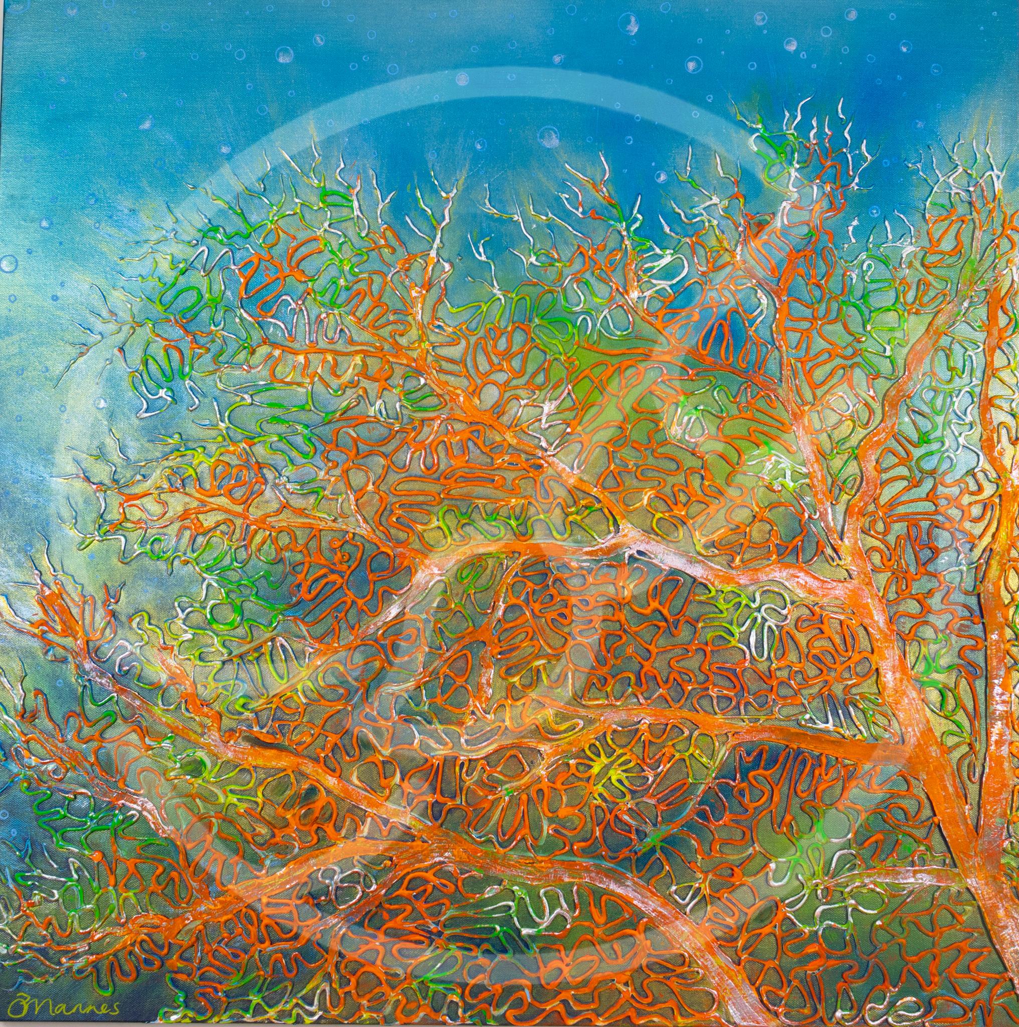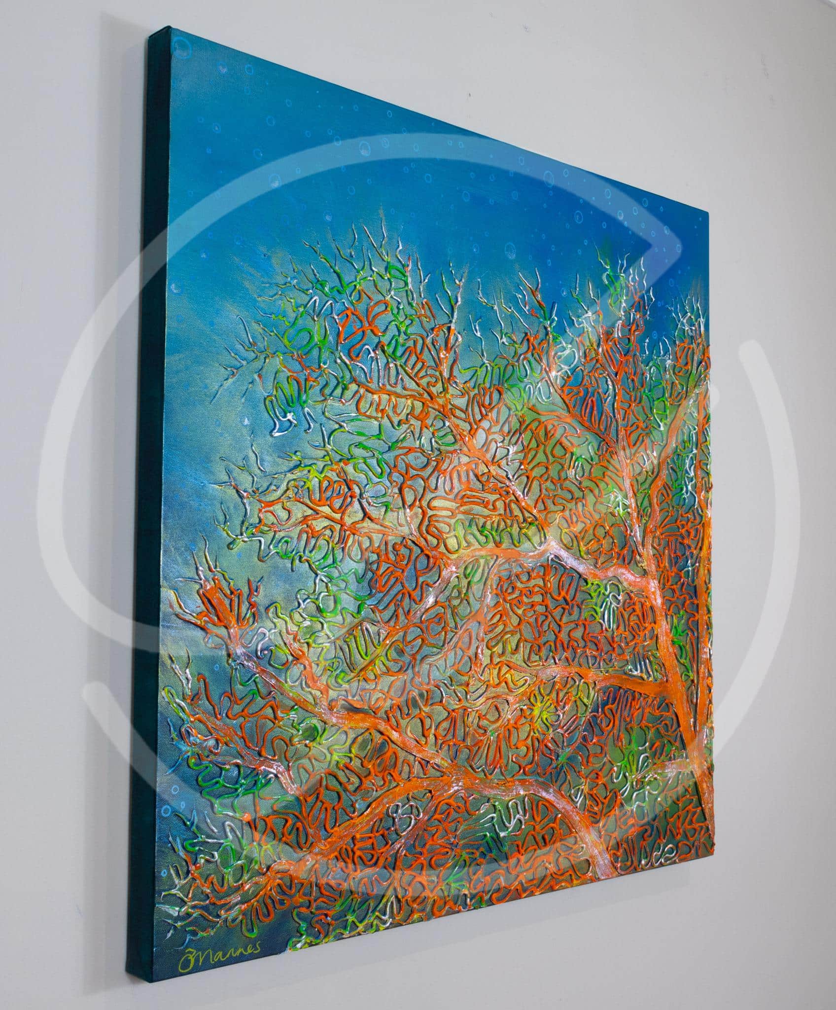“Orange sea bloom” 30′ x 30′ (76cm x 76cm) mixed media on stretched canvas. Thick, textural coral like shapes with bright orange highlights add an interesting layer to the soft metallic sea tones in the background. Unframed.